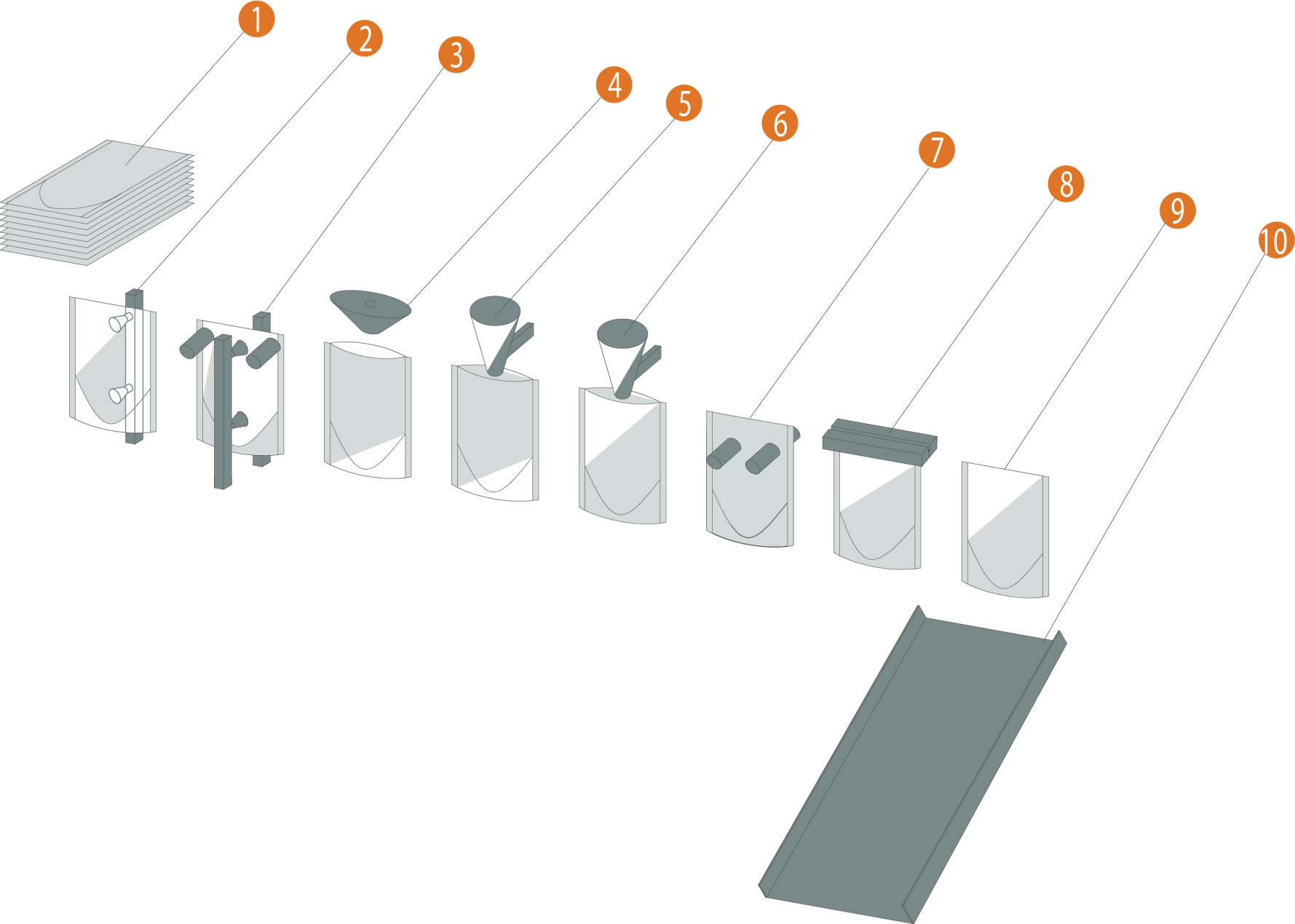 1.預(yù)制袋疊放 2. 翻轉(zhuǎn)取袋機(jī)構(gòu) 3. 開袋機(jī)構(gòu) 4. 吹氣機(jī)構(gòu) 5. 一次灌裝 6. 二次灌裝 7. 展袋 8. 上封 9. 成品 10. 成品輸出