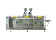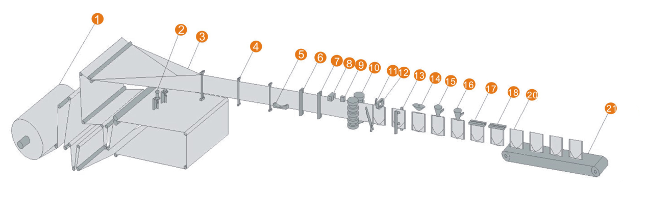 1. 放膜機構 2. 底部沖孔 3.包裝膜成型 4. 包裝膜導向 5. 底封機構 6. 豎封機構I 7. 豎封機構II 8.易撕口裝置 9.色標檢測 10. 伺服牽袋 11. 剪切機構 12. 夾袋 13. 開袋機構 14. 吹氣裝置 15. 充填I 16. 充填II 17. 上封I 18. 上封II 19. 成品 20. 成品輸出