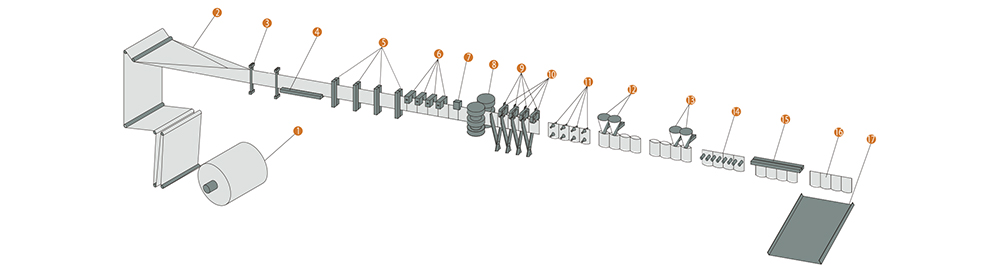 1. 放膜機(jī)構(gòu) 2.包裝膜成型 3. 包裝膜導(dǎo)向 4. 底封機(jī)構(gòu) 5. 豎封機(jī)構(gòu) 6.易撕口裝置