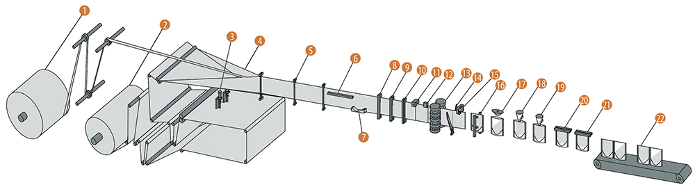 15. 夾袋 16. 開袋機(jī)構(gòu) 17. 吹氣裝置 18. 充填I(lǐng) 19. 充填I(lǐng)I 20. 上封I 21. 上封II 22. 成品輸出