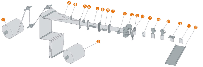 1.放拉鏈機(jī)構(gòu) 2. 放膜機(jī)構(gòu) 3.包裝膜成型 4. 拉鏈導(dǎo)向 5. 包裝膜導(dǎo)向 6. 色標(biāo)檢測(cè) 7. 上封拉鏈 8. 豎封拉鏈機(jī)構(gòu)I 9. 底封機(jī)構(gòu) 10. 豎封機(jī)構(gòu) 11.易撕口裝置 12. 伺服牽袋 13. 剪切機(jī)構(gòu) 14. 夾袋 15 開袋機(jī)構(gòu) 16. 充填I(lǐng) 17. 充填I(lǐng)I 18. 上封 19.. 成品 20. 成品輸出
