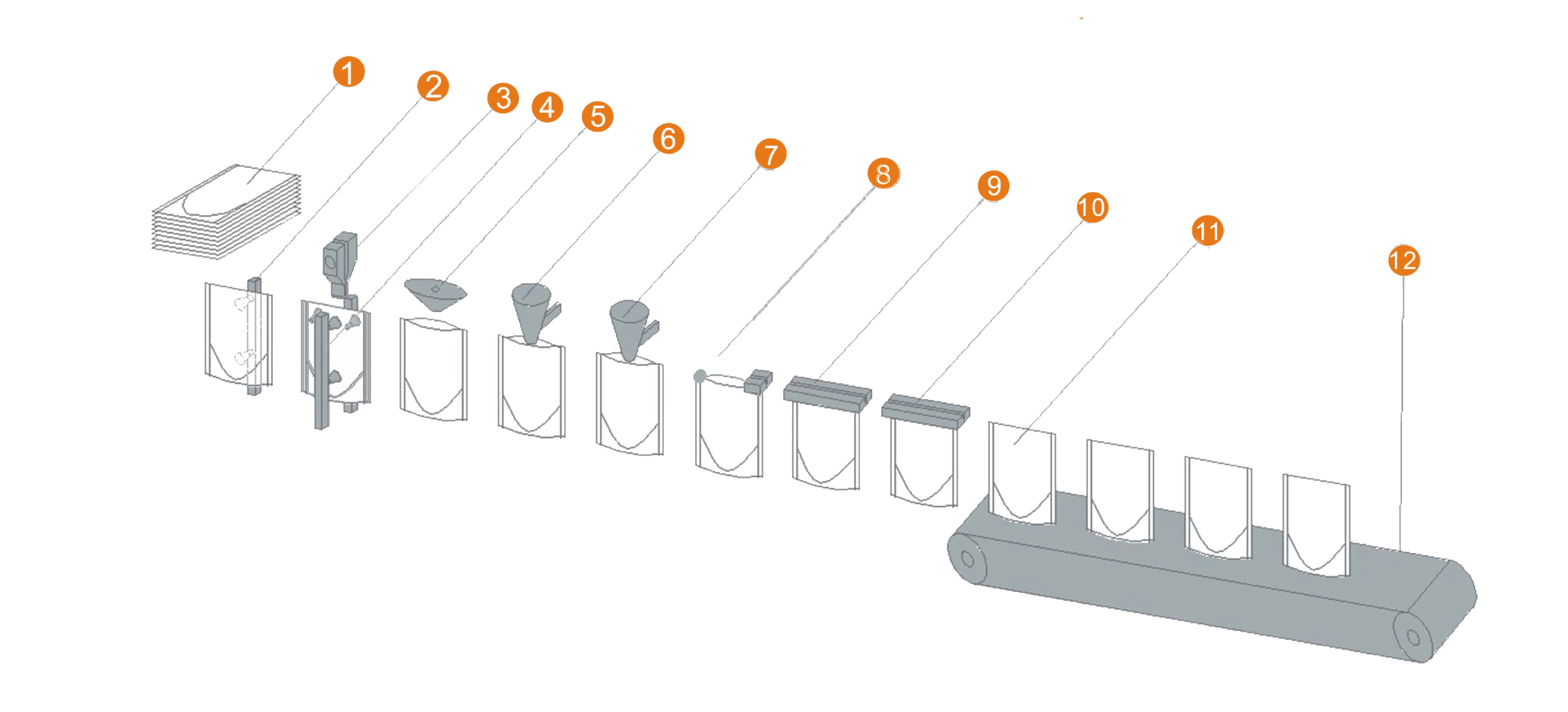 1.預(yù)制袋疊放 2. 翻轉(zhuǎn)取袋機(jī)構(gòu) 3. 開拉鏈機(jī)構(gòu) 4. 開袋機(jī)構(gòu) 5. 吹氣機(jī)構(gòu) 6. 一次灌裝 7 二次灌裝 8. 展袋 9 上封 I 10. 上封 II 11. 成品 12. 成品輸出