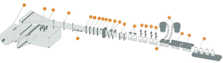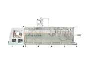 1. 放膜機(jī)構(gòu) 2. 底部沖孔 3.包裝膜成型 4. 包裝膜導(dǎo)向 5. 底封機(jī)構(gòu) 6. 豎封機(jī)構(gòu)I 7. 豎封機(jī)構(gòu)II 8.色標(biāo)檢測(cè) 9. 伺服牽袋 10. 剪切機(jī)構(gòu) 11. 夾袋I 12. 夾袋II 13. 斜切機(jī)構(gòu) 14. 第一開(kāi)袋 15. 振動(dòng)裝置 16. 加嘴裝置 17. 封嘴裝置 18. 第二開(kāi)袋19. 吹氣裝置 20. 充填I(lǐng) 21. 充填I(lǐng)I 22. 展袋 23. 上封I 24. 上封II 25. 成品 26. 成品輸出
