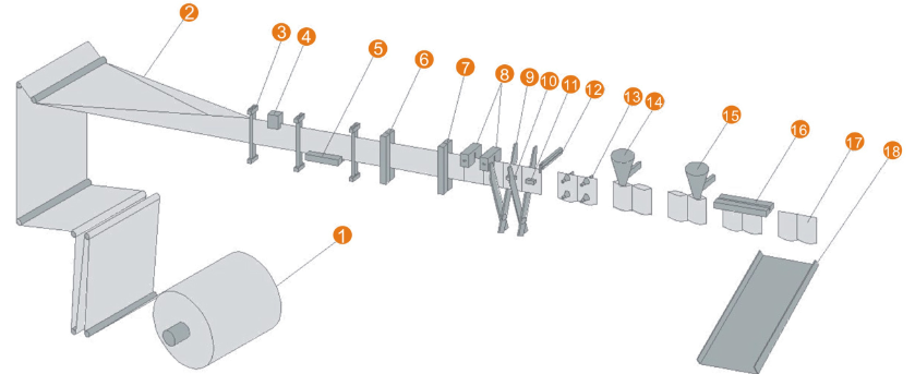 1. 放膜機構 2.包裝膜成型 3. 包裝膜導向 4. 色標檢測5. 底封機構 6. 豎封機構 7. 豎封機構II 8.易撕口裝置 9. 雙剪切機構 10 夾袋機構 11. 夾袋機構 12. 牽袋機構 13. 開袋機構 14. 充填I 15. 充填II 16. 上封 17. 成品 18. 成品輸出