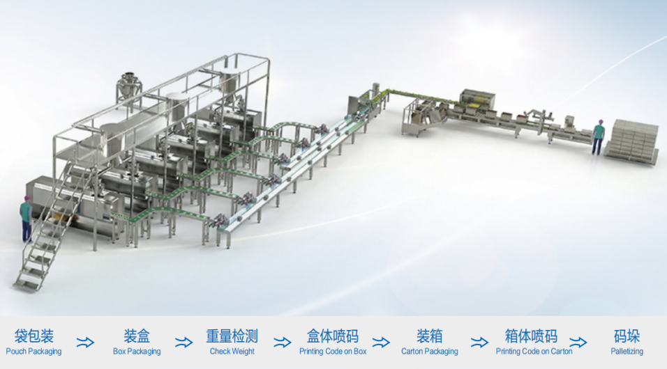 該項(xiàng)目采用正壓供料系統(tǒng)為6臺(tái)包裝機(jī)集中供料,物料經(jīng)S-180D型水平式雙出袋全自動(dòng)包裝進(jìn)行全自動(dòng)袋包裝包裝,并完成包裝袋的日期打碼;成品袋經(jīng)輸送帶由數(shù)包疊袋設(shè)備進(jìn)行計(jì)數(shù)疊袋碼垛,輸送至格子收集輸送線上,通過(guò)旋轉(zhuǎn)推袋裝置把成品袋豎向推進(jìn)裝盒機(jī)輸送帶隔板里由裝盒機(jī)完成裝盒;盒裝產(chǎn)品經(jīng)過(guò)稱重系統(tǒng)對(duì)單盒進(jìn)行檢重,剔除重量不合格產(chǎn)品,對(duì)合格產(chǎn)品進(jìn)行盒體小字噴碼;盒裝成品輸送到裝箱機(jī)整列輸送線上,裝箱機(jī)自動(dòng)整列裝箱;開(kāi)箱機(jī)自動(dòng)開(kāi)箱,輸送給裝箱機(jī);裝箱成品經(jīng)輸送帶送入自動(dòng)封箱機(jī)封箱,大字箱體噴碼,人工整理碼垛。整線為全自動(dòng)化,由整線連線總控制系統(tǒng)控制。