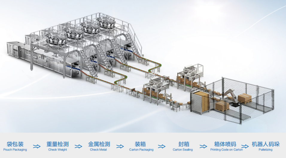 該項(xiàng)目為全自動(dòng)自立袋包裝整線解決方案,物料經(jīng)4臺(tái)全自動(dòng)水平式自立袋包裝機(jī)進(jìn)行包裝,并完成包裝袋的日期打碼;自立袋成品經(jīng)輸送帶由稱重系統(tǒng)對(duì)單袋進(jìn)行檢重,剔除重量不合格產(chǎn)品,對(duì)合格產(chǎn)品進(jìn)行在線金屬檢測(cè);成品輸送到裝箱機(jī)整列輸送線上,裝箱機(jī)自動(dòng)整列裝箱;開(kāi)箱機(jī)自動(dòng)開(kāi)箱,輸送給裝箱機(jī);裝箱成品經(jīng)輸送帶送入自動(dòng)封箱機(jī)封箱,大字箱體噴碼;合格的成品箱經(jīng)由碼垛機(jī)器人進(jìn)行全自動(dòng)碼垛。整線為全自動(dòng)化,由整線連線總控制系統(tǒng)控制。